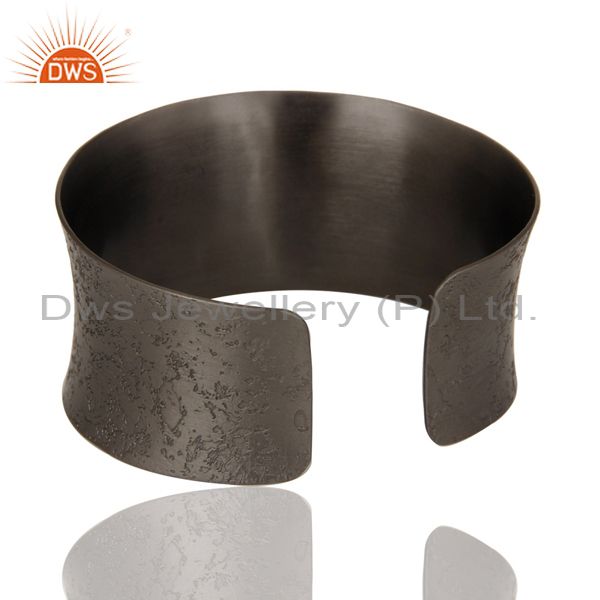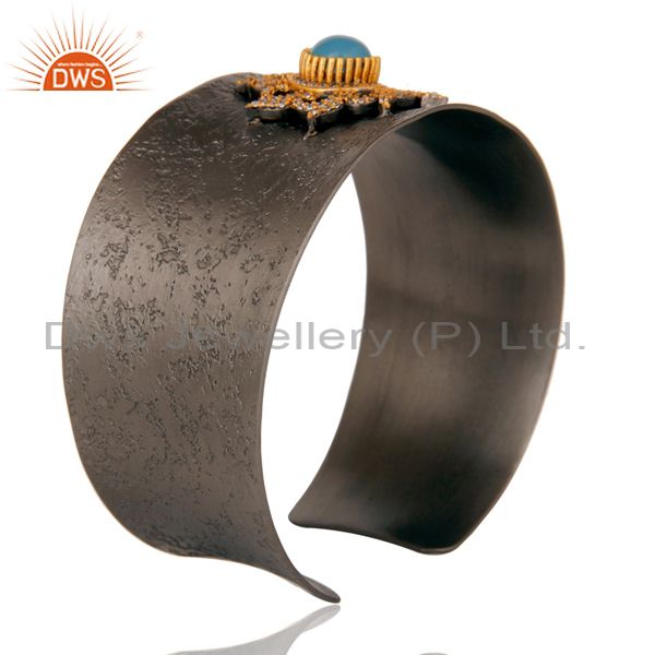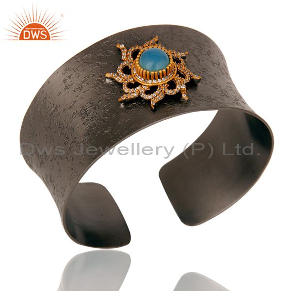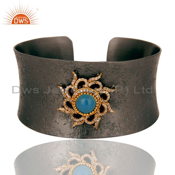 Blue Chalcedony and Zircon Black Oxidized Comfort Fit Wide Cuff Unique Bangle