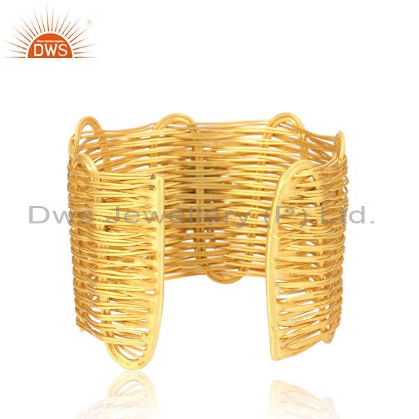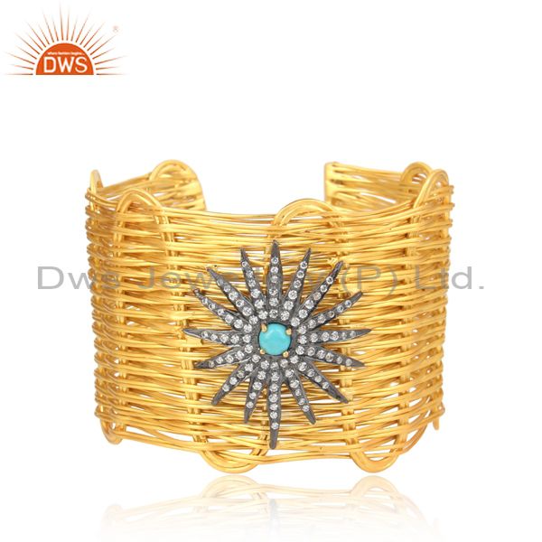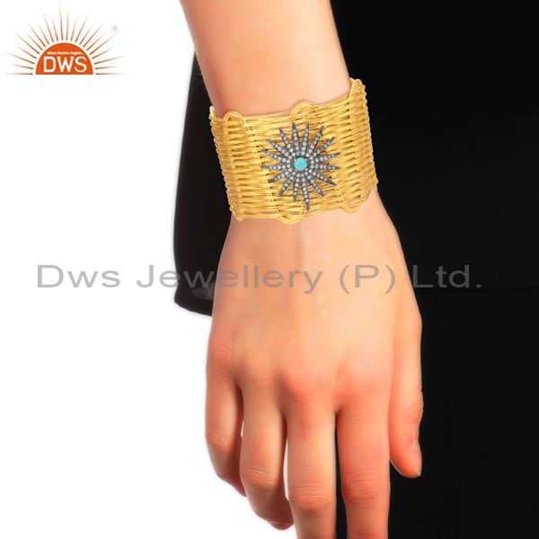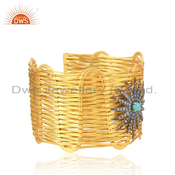 CZ And Turquoise Set Gold On Silver Rope Wired Cuff Bangle