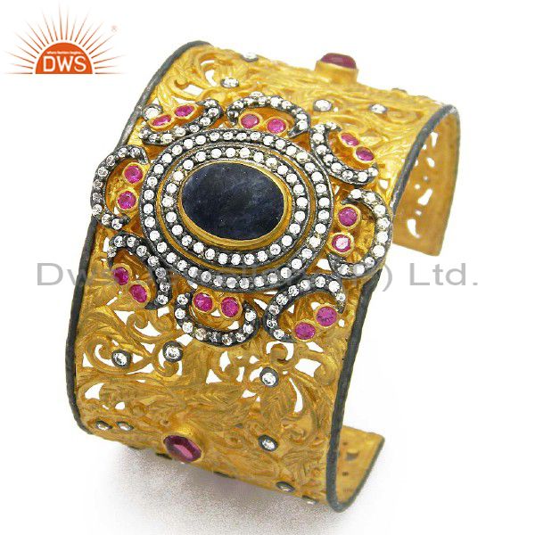 Gold Plated Lapis Lazuli And Cz Floral Filigree Cuff