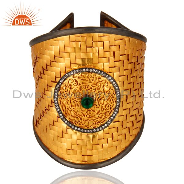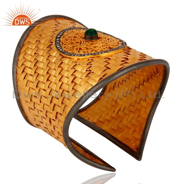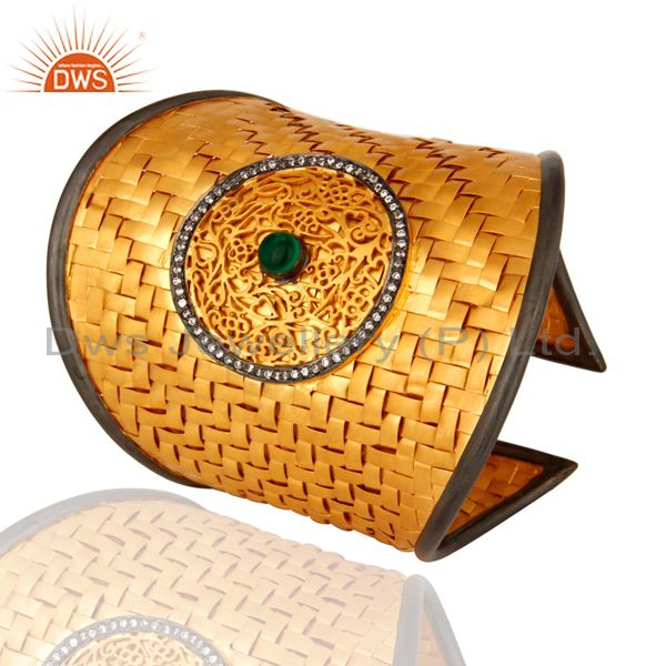 Green Onyx & Cz 24K Gold Plated Sterling Silver Wire Woven Cuff Bracelet Bangle