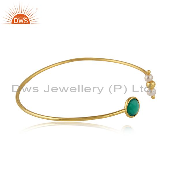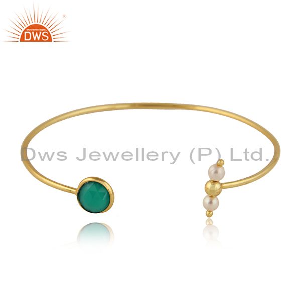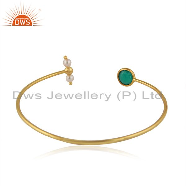 Green Onyx Natural Pearl Designer Gold Plated Silver Cuff Bangle