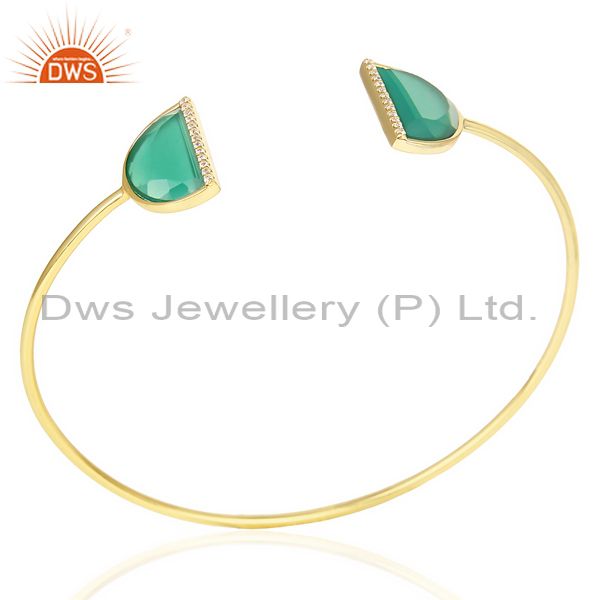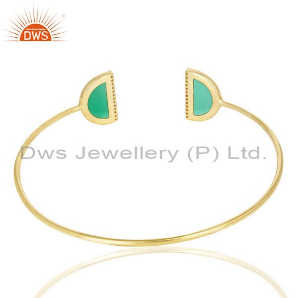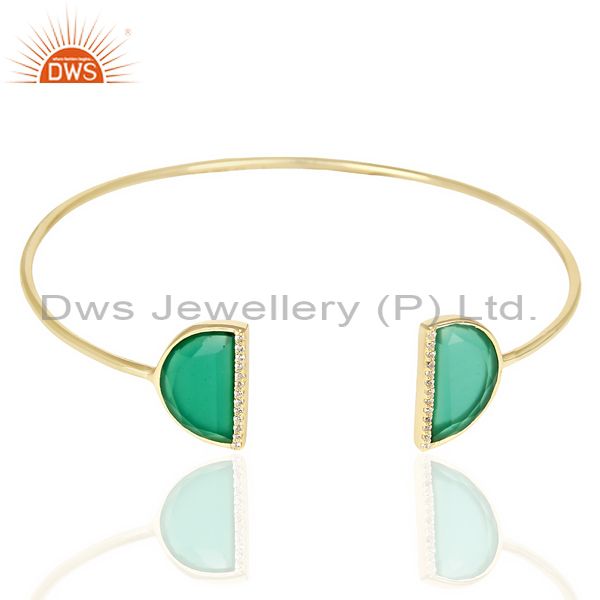 Green Onyx Two Half Moon Studded Gold Plate Bangle In Sterling Silver