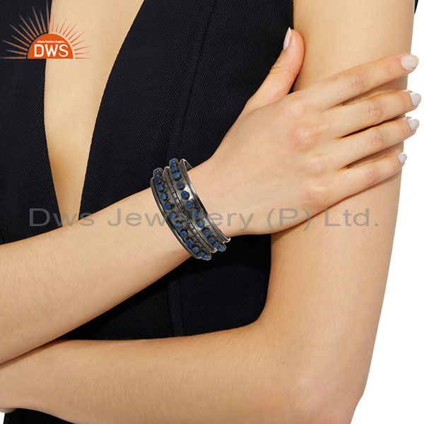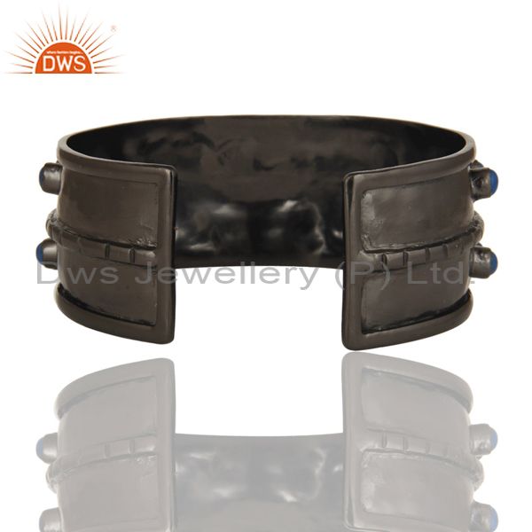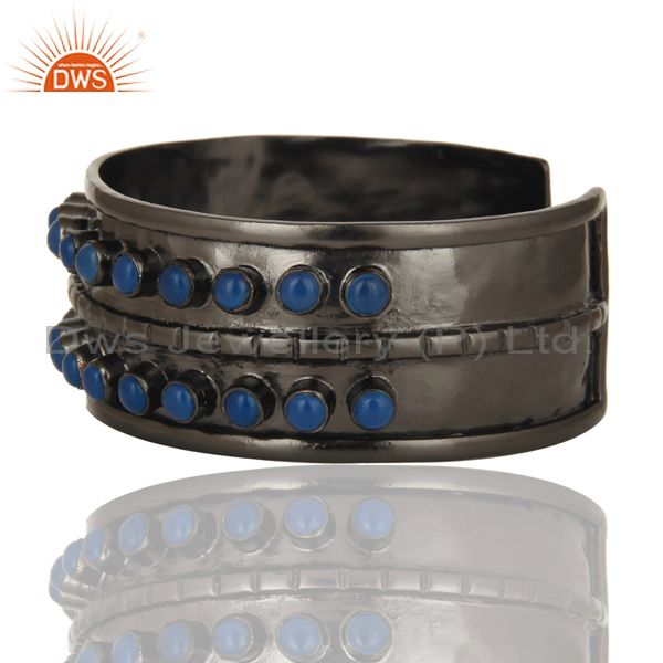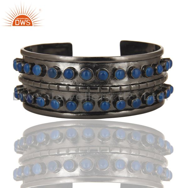 Handcrafted Black Oxidized Wide Brass Cuff Bangle With Dyed Blue Chalcedony