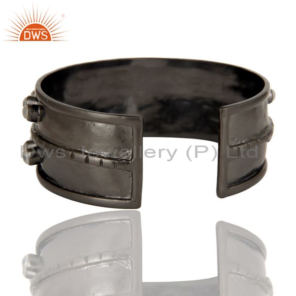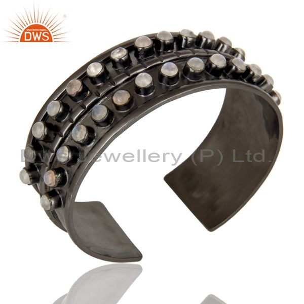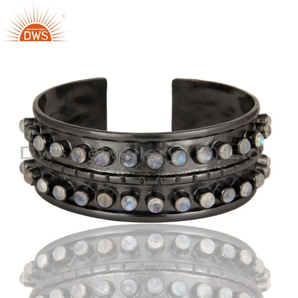 Handcrafted Black Oxidized Wide Brass Cuff Bangle With Rainbow Moonstone