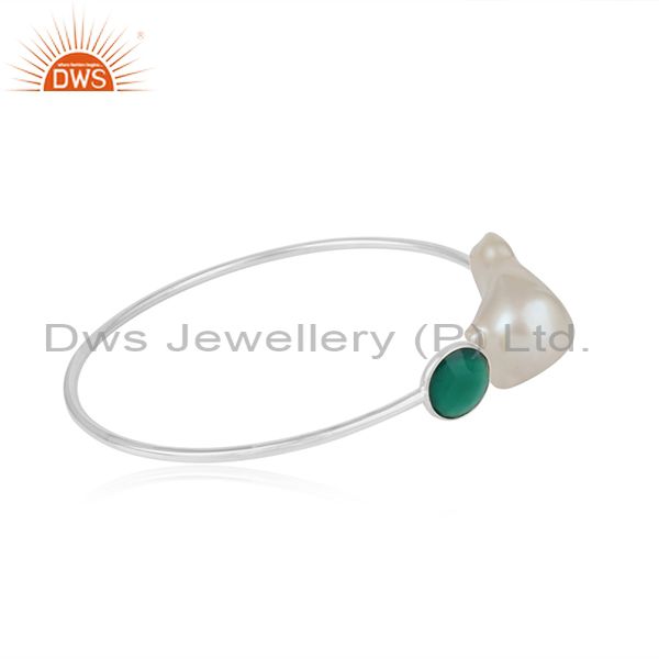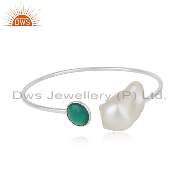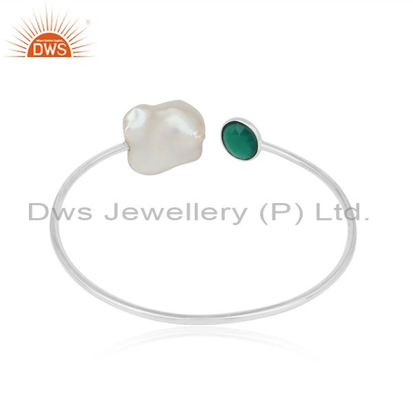Handcrafted Designer Silver Cuff with Green Onyx and Natural Pearl