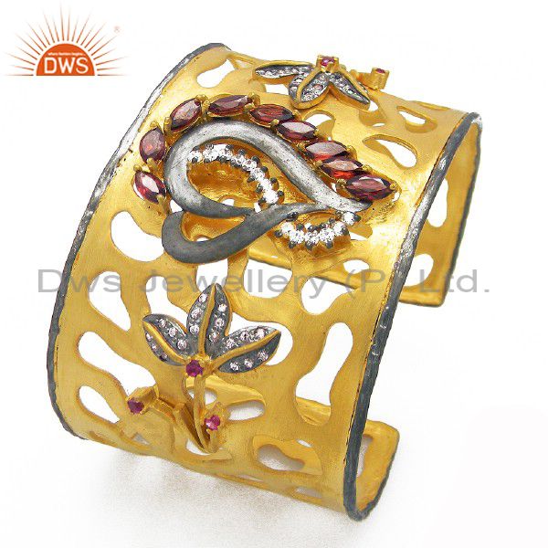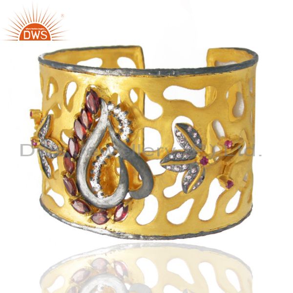 Handcrafted Gold Plated Garnet And Cz Floral Cuff