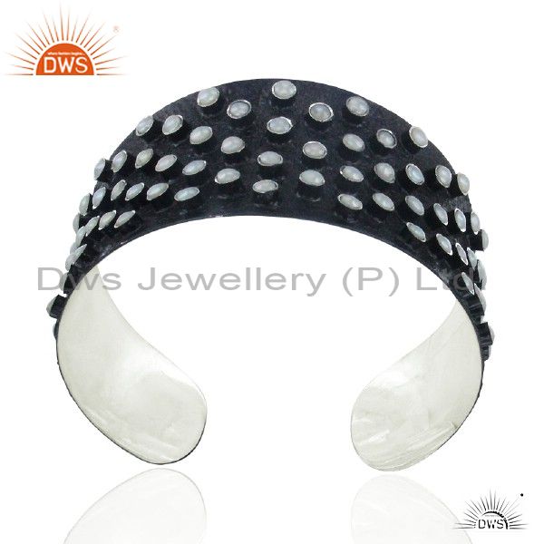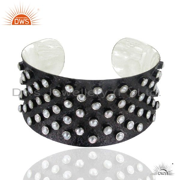 Handmade Oxidized Sterling Silver Natural Pearl Wide Cuff Bracelet Jewelry
