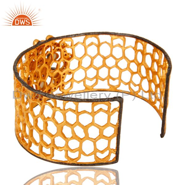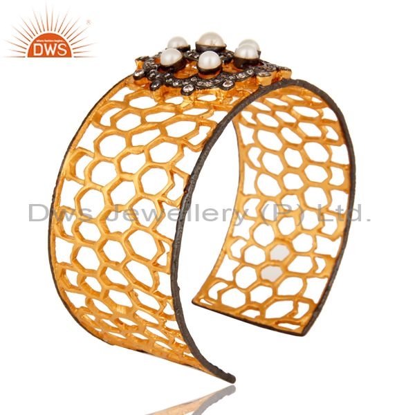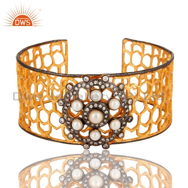 Handmade Pearl And Cz Filigree Cuff Bracelet With Yellow Gold Plated
