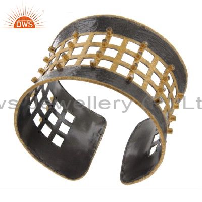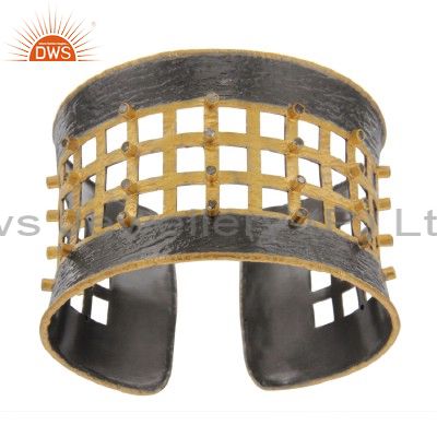Oxidized And 18K Gold Sterling Silver Pave Diamond Designer Wide Cuff Bracelet