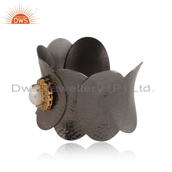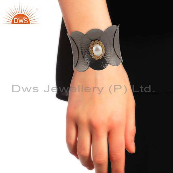 Pearl And Cubic Zirconia Sterling Silver Rhodium Plated Cuff