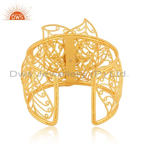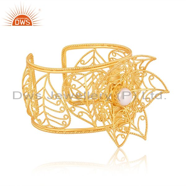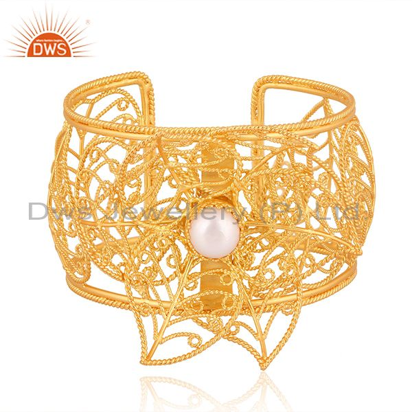 Round Pearl Set 18K Gold On 925 Silver Ethnic Design Cuff