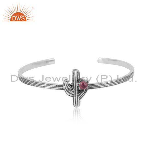 Textured Cactus Oxidized Silver 925 Bangle with Pink Tourmaline