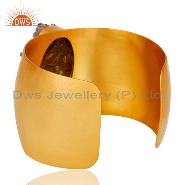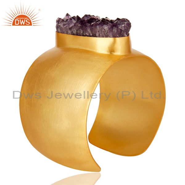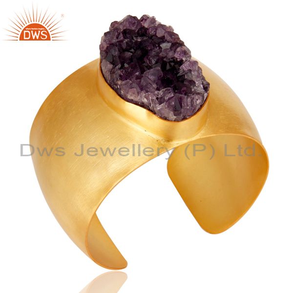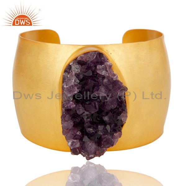 Traditional Handmade 22K Gold Plated Wide Druzy Amethyst Openable Brass Bangle