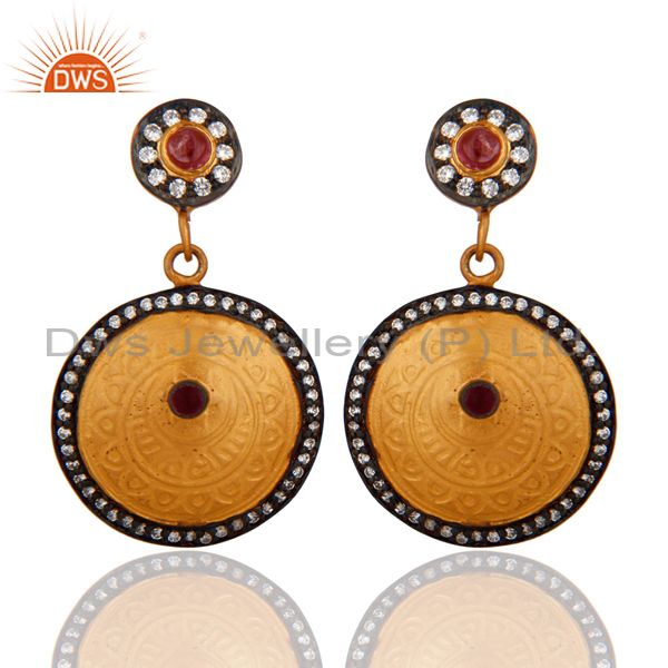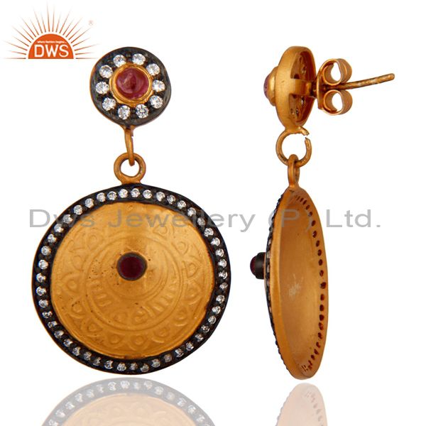 14K Gold On Sterling Silver Engraved Disc Design Tourmaline & Cz Dangle Earrings