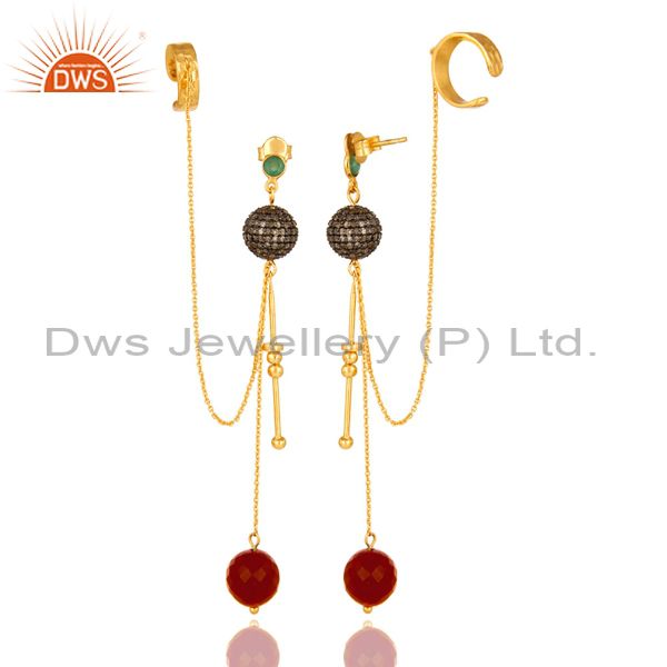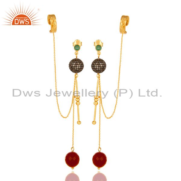 14K Gold Over Sterling Silver Pave Diamond & Emerald Chain Ear Cuff Earrings