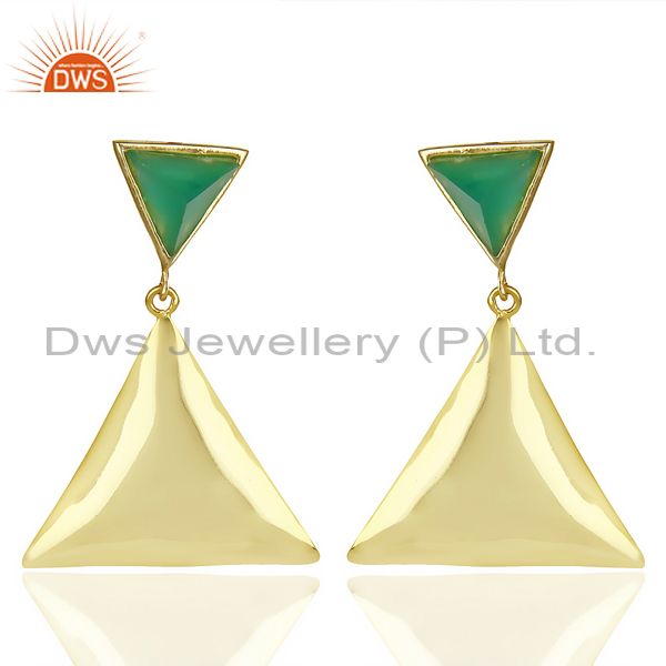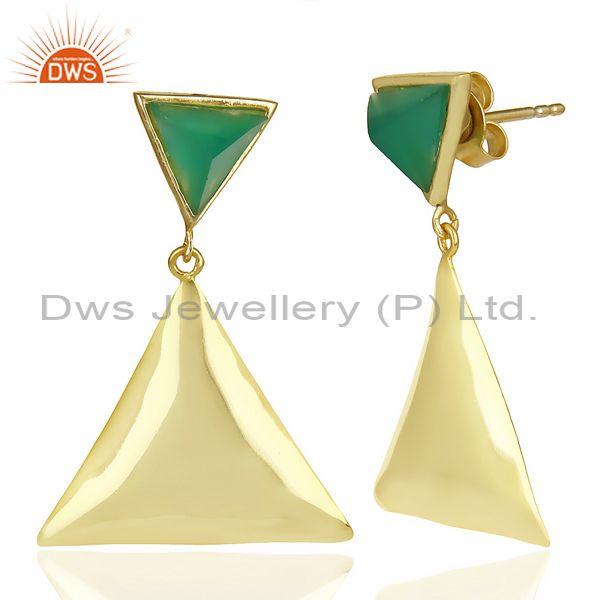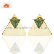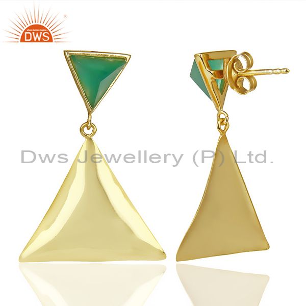 14K Gold Plated 925 Silver Handmade Pyramid Design Green Onyx Drops Earrings