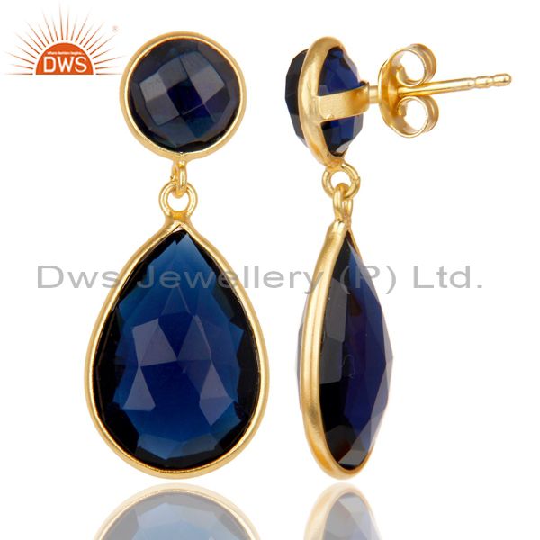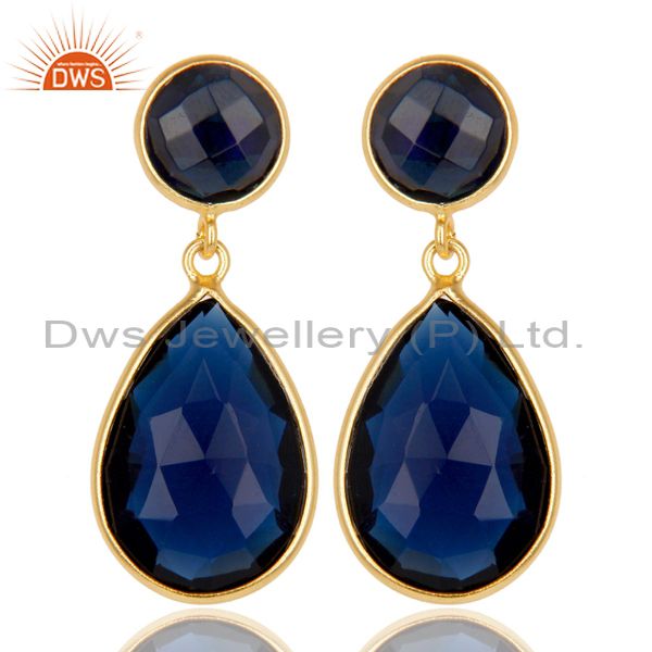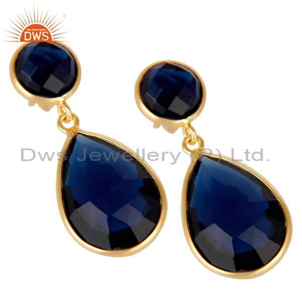 14K Gold Plated 925 Sterling Silver Blue Corrundum Bezel Set Drops Earrings