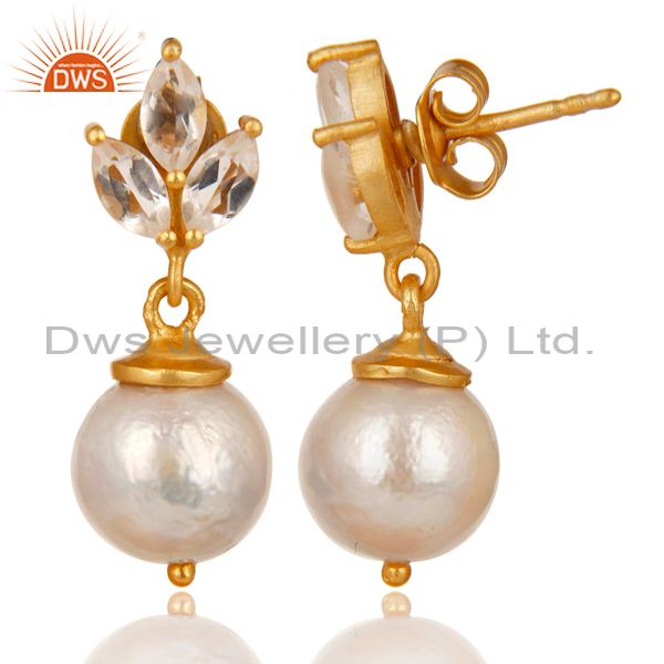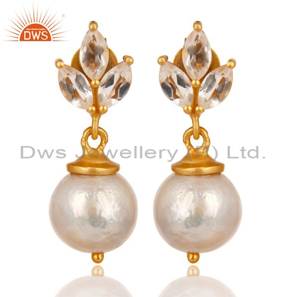 14K Gold Plated 925 Sterling Silver Crystal Quartz & Pearl Beads Drops Earrings