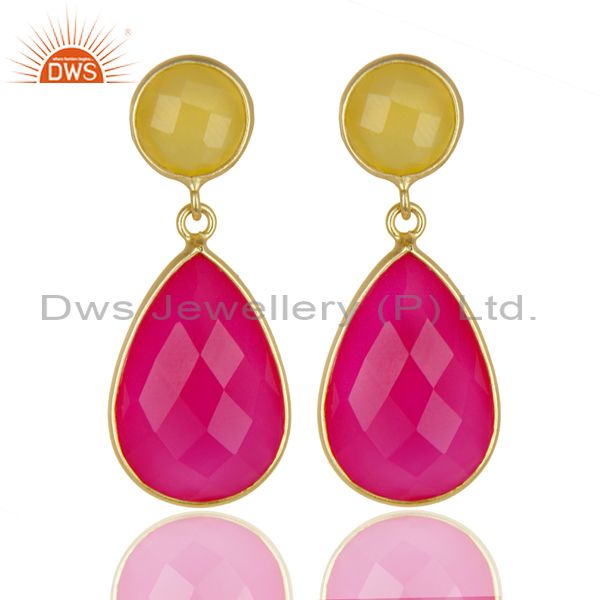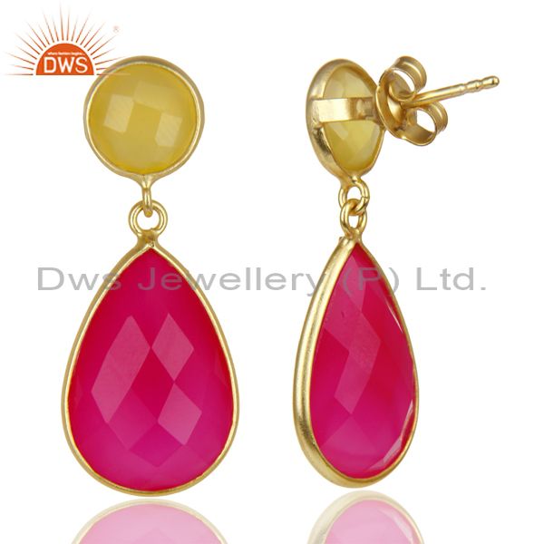 14K Gold Plated 925 Sterling Silver Dyed Yellow Pink Chalcedony Drops Earrings