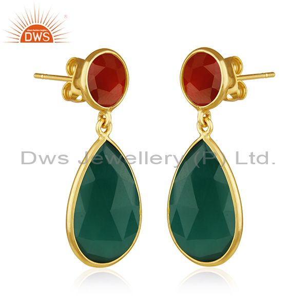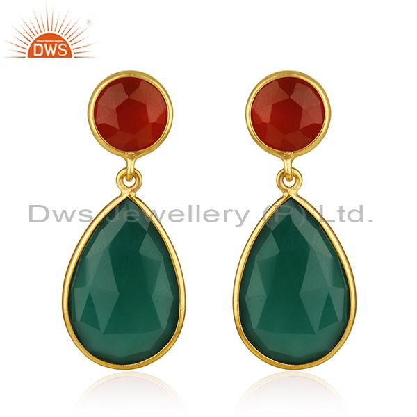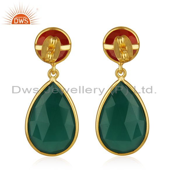 14K Gold Plated 925 Sterling Silver Green Red Onyx Bezel Set Drops Earrings