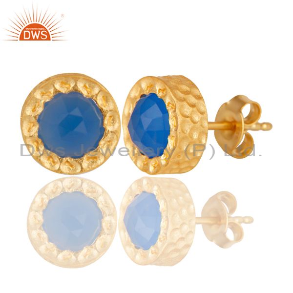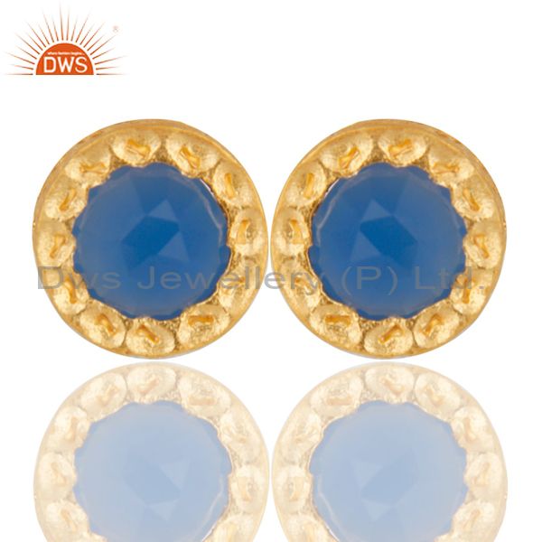 14K Gold Plated 925 Sterling Silver Handmade Dyed Blue Chalcedony Stud Earrings