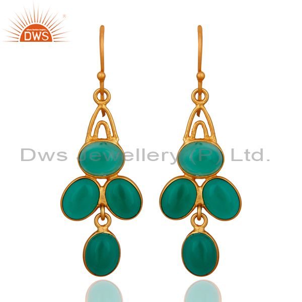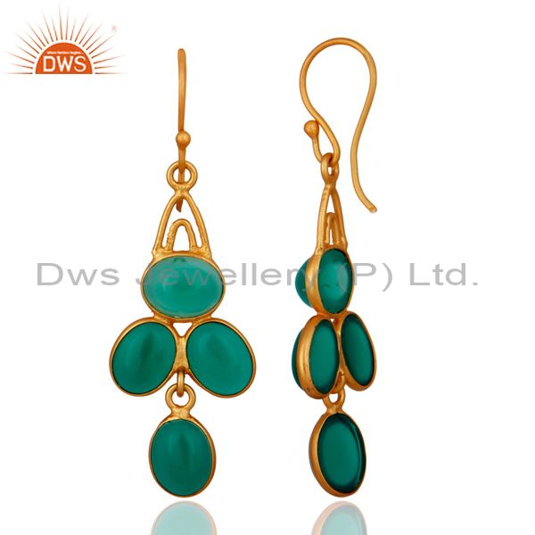 14K Gold Plated 925 Sterling Silver Handmade Green Onyx Bezel Set Earrings