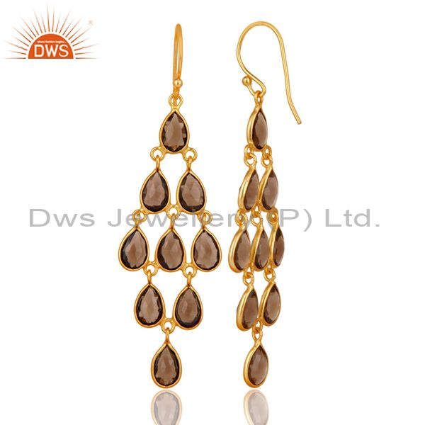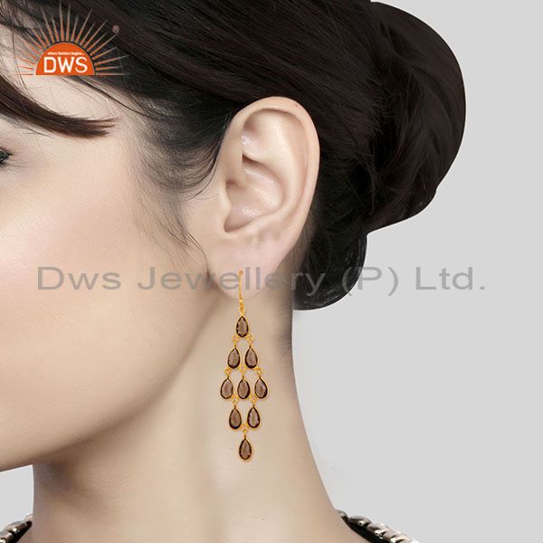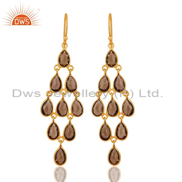 14K Gold Plated 925 Sterling Silver Smokey Topaz Bezel Set Dangle Earrings