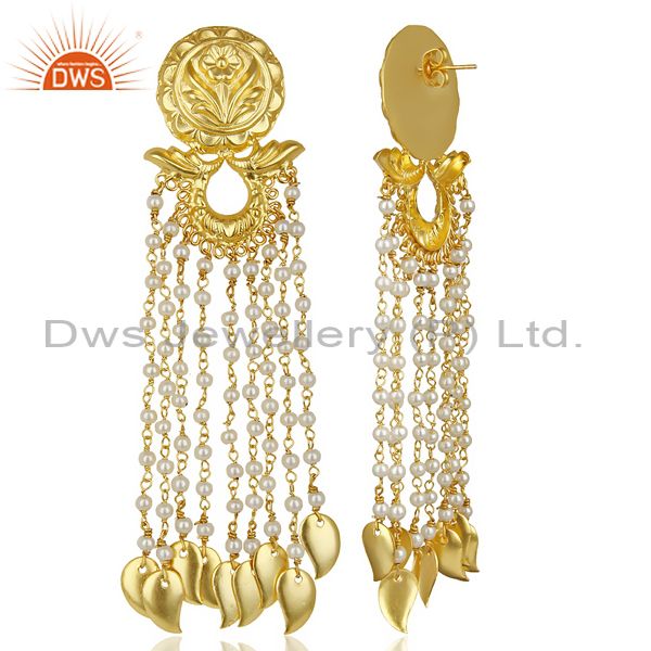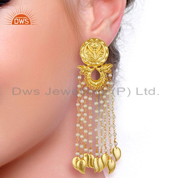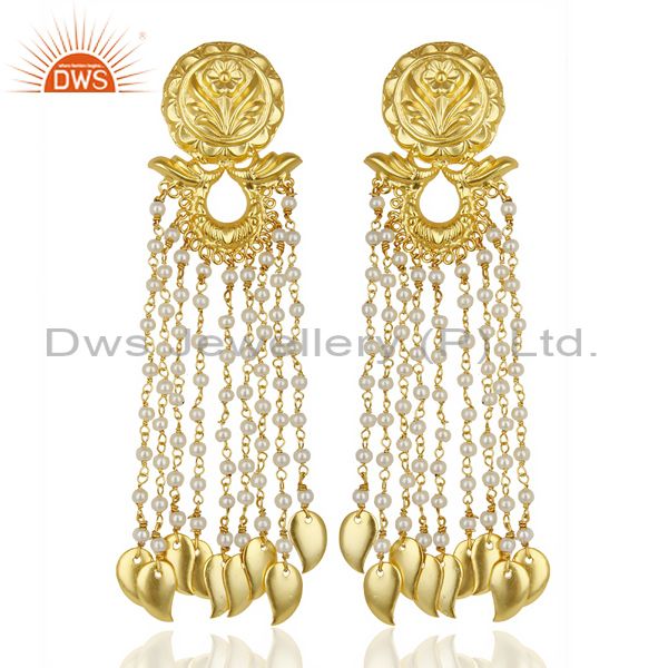 14K Gold Plated Flower Carving Natural Pearl Chandelier Fashion Earring Jewelry