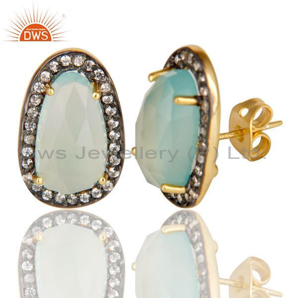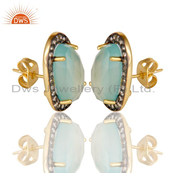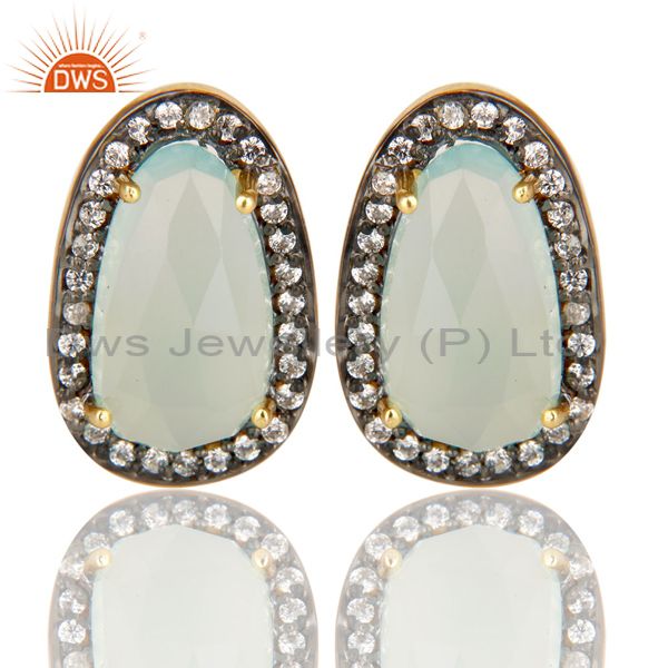 14K Gold Plated Handmade Aqua Chalcedony & White Zirconia Studs Brass Earrings