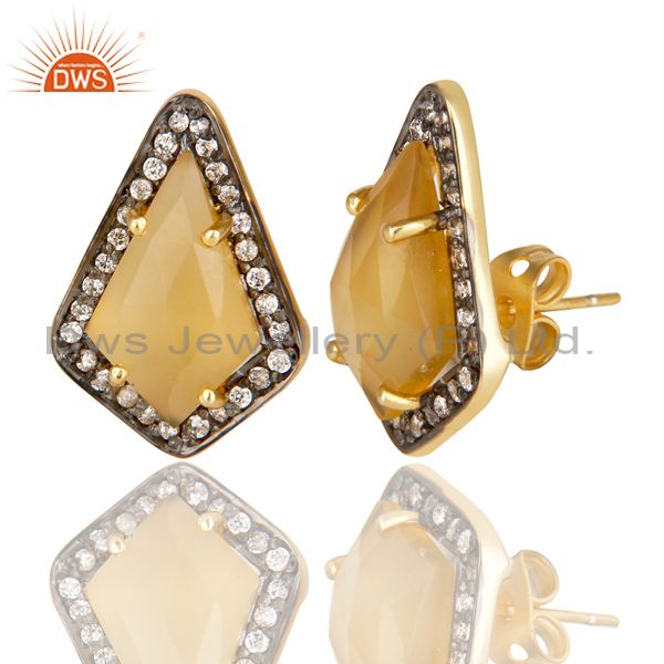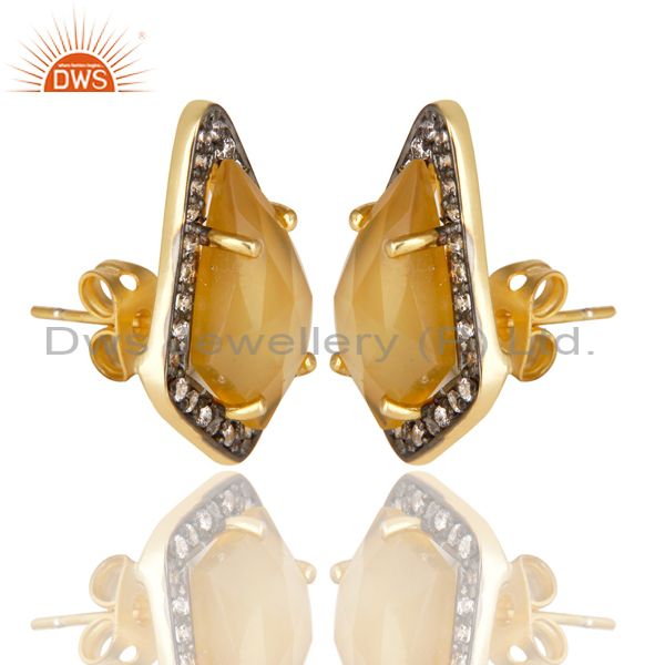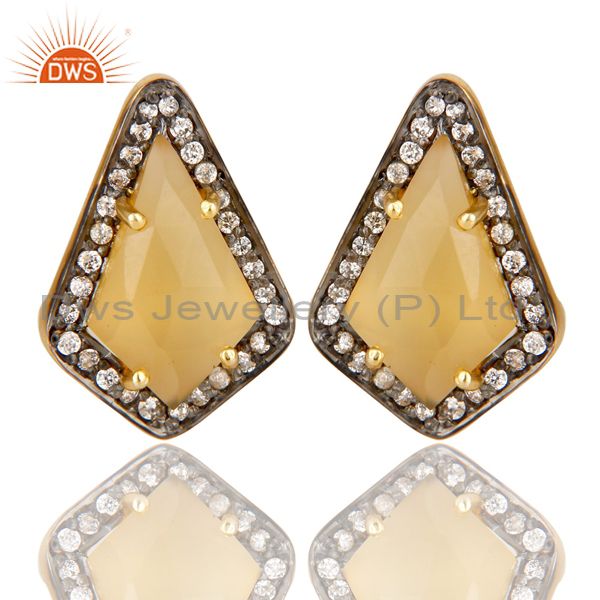 14K Gold Plated Handmade Dyed Chalcedony & CZ Prong Set Studs Brass Earrings