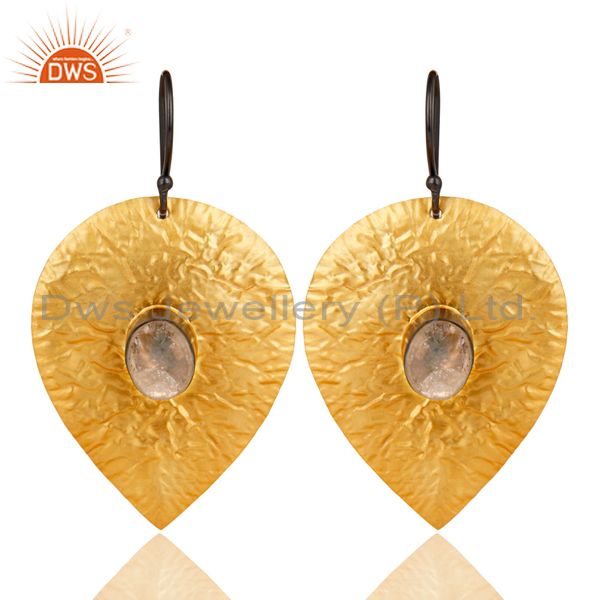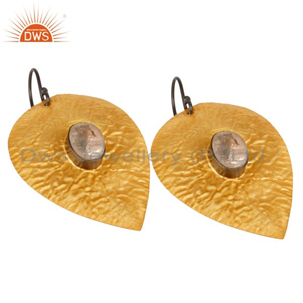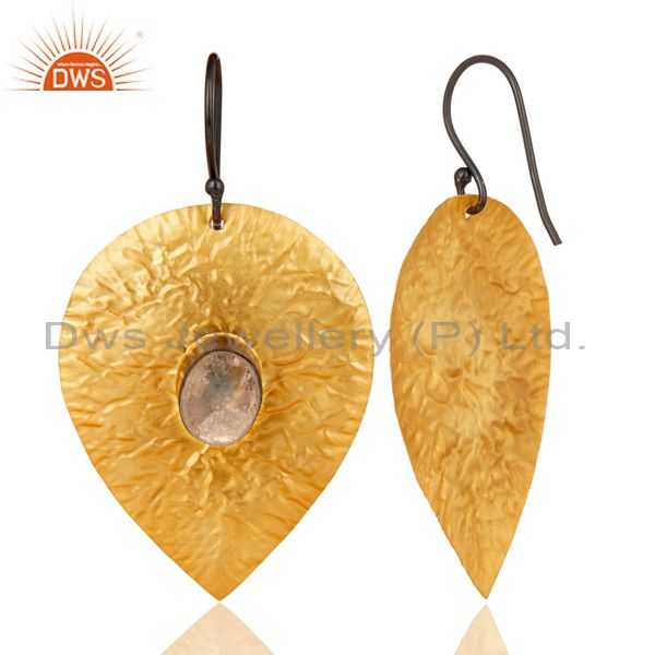 14K Gold Plated Handmade Leaf Design Crystal Quartz Drops Brass Earrings