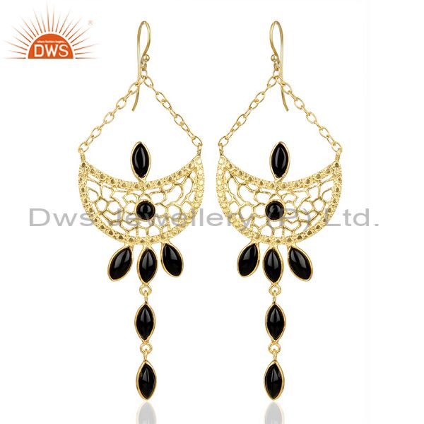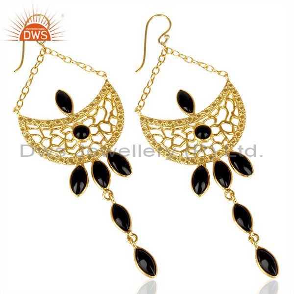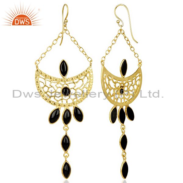 14K Gold Plated Handmade Natural Black Onyx Bezel Set Dangle Brass Earrings