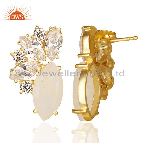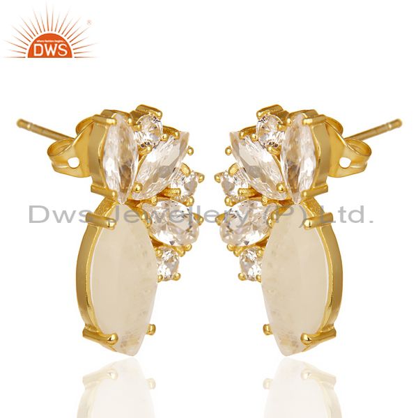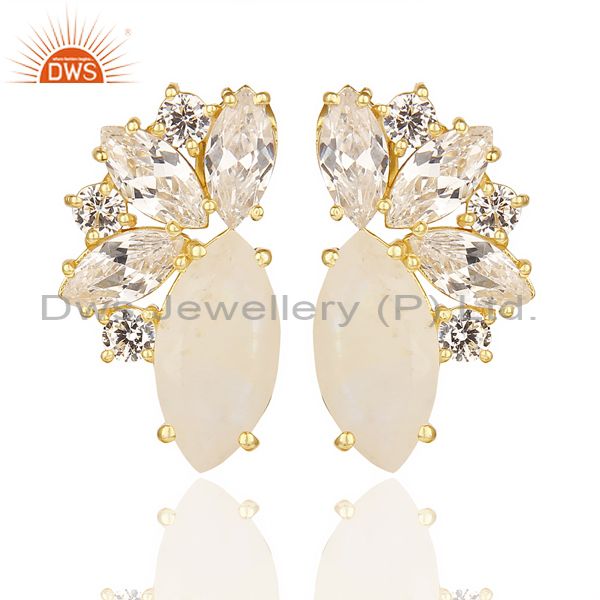 14K Gold Plated Handmade Rainbow Moonstone & White Zircon Drops Brass Earrings