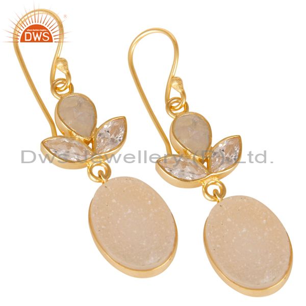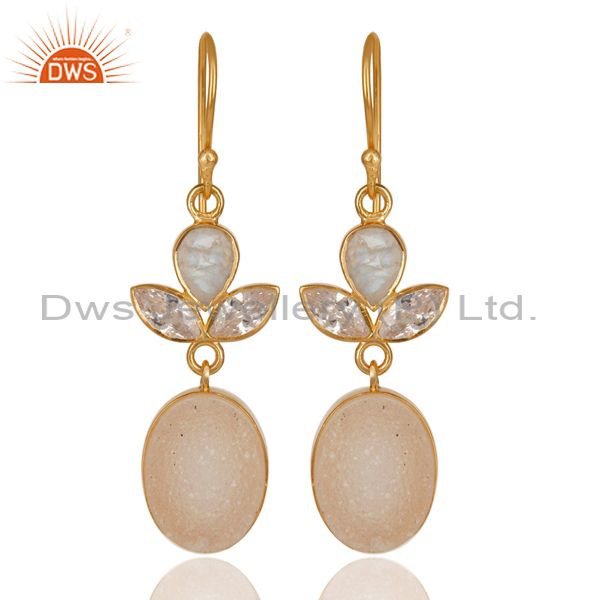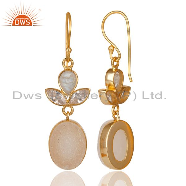14K Gold Plated Rainbow Moonstone Druzy & White Zircon Brass Drops Earrings