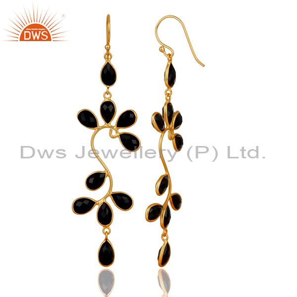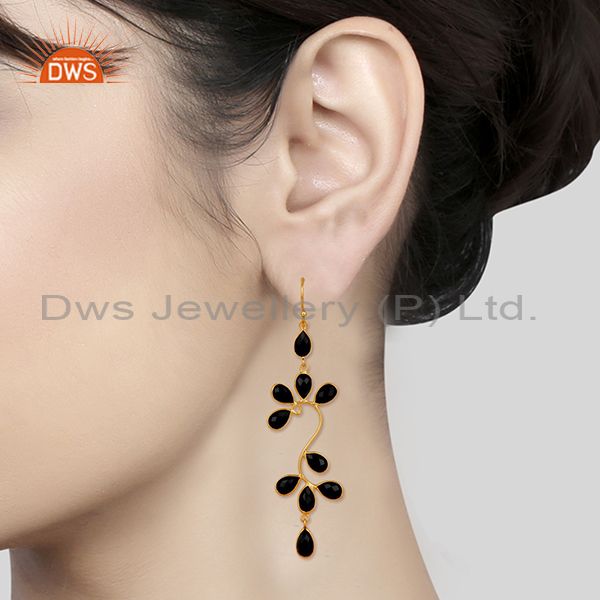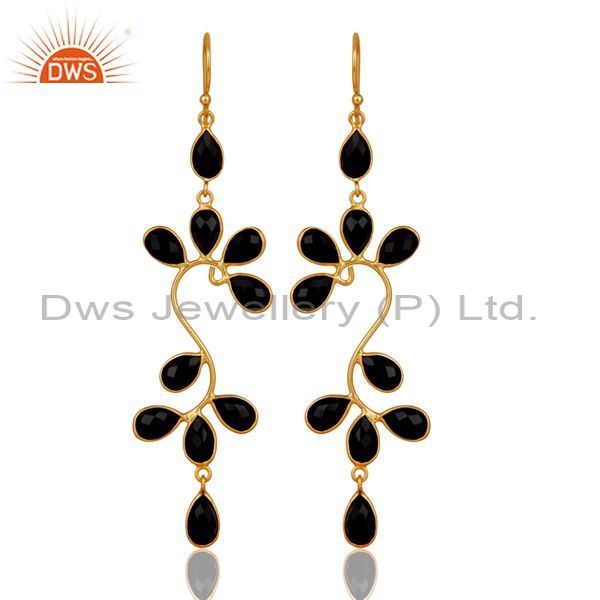 14K Gold Plated Sterling Silver Black Onyx Gemstone Bezel Set Dangle Earrings