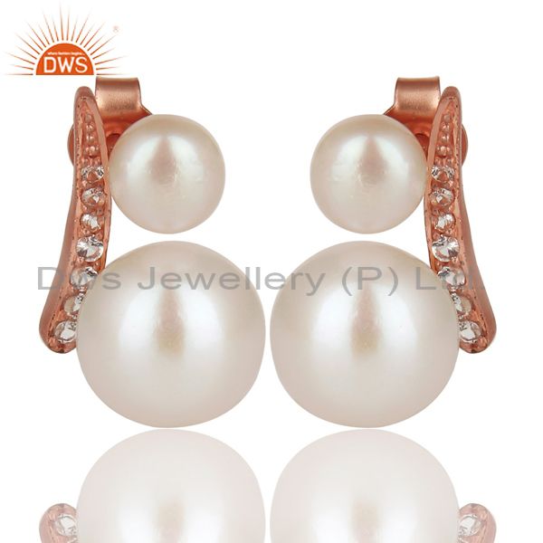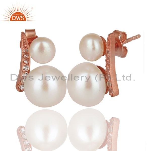 14K Rose Gold Plated 925 Sterling Silver Pearl & White Topaz Studs Earrings