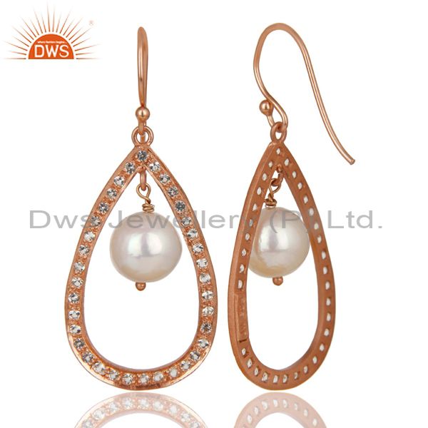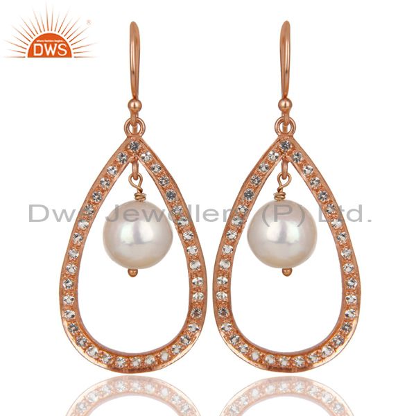 14K Rose Gold Plated Sterling Silver White Topaz & Pearl Beads Drops Earrings