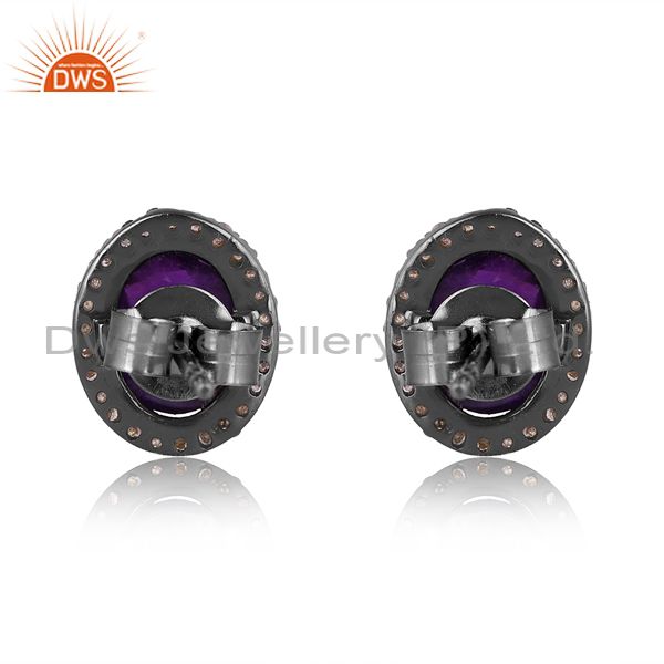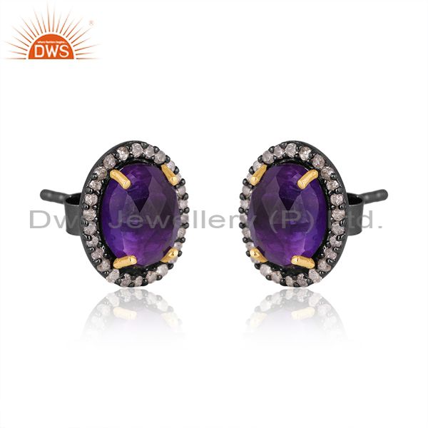 14K Solid Yellow Gold Amethyst Gemstone Ladies Stud Earrings With Pave Diamond