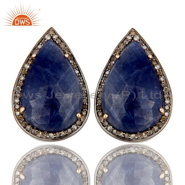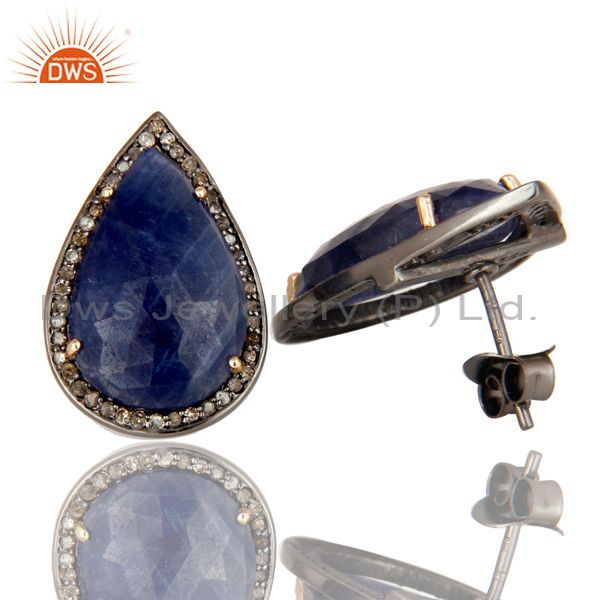 14K Solid Yellow Gold Pave Diamond And Blue Sapphire Pear Shape Stud Earrings