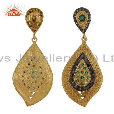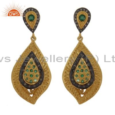 14K Yellow Gold Over Sterling Silver Pave Diamond And Emerald Dangle Earrings