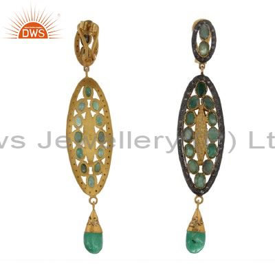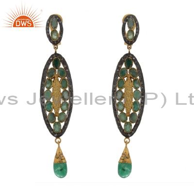 14K Yellow Gold Over Sterling Silver Pave Set Diamond Emerald Dangle Earrings