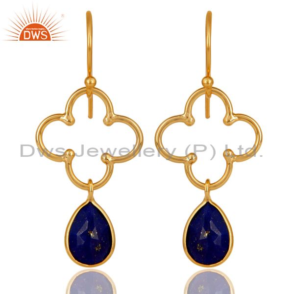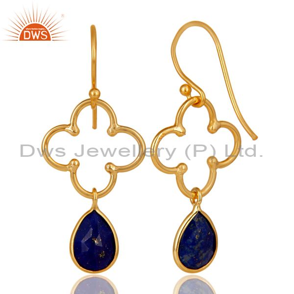 14K Yellow Gold Plated 925 Sterling Silver Lapis Lazuli Artisan Dangle Earrings