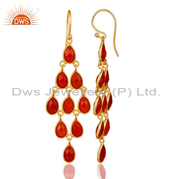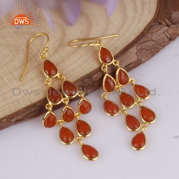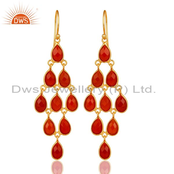 14K Yellow Gold Plated 925 Sterling Silver Red Onyx Bezel Set Dangle Earrings