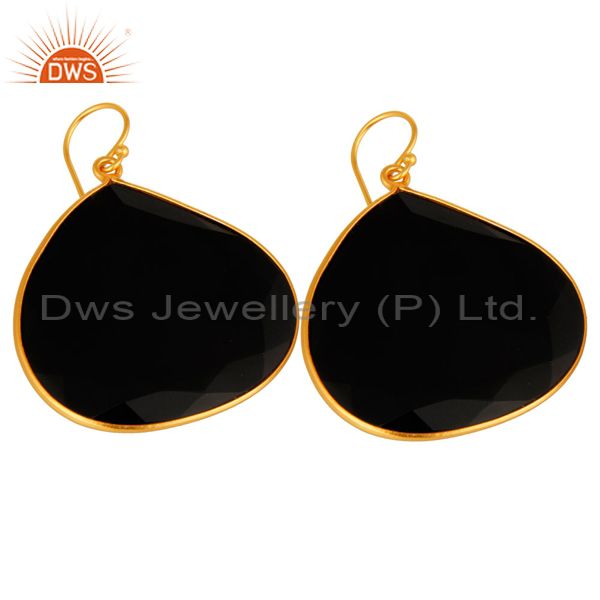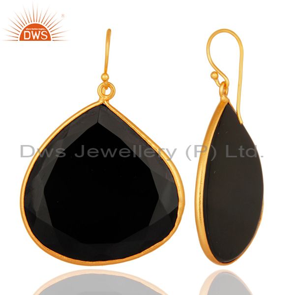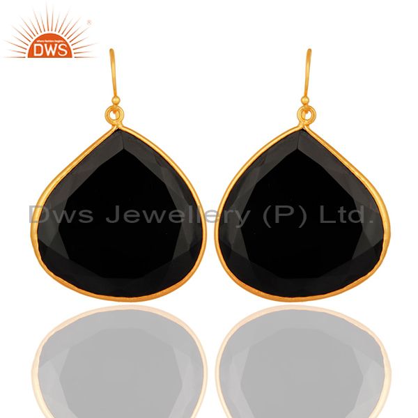 14K Yellow Gold Plated Black Onyx Sterling Silver Bezel-Set Drop Earrings