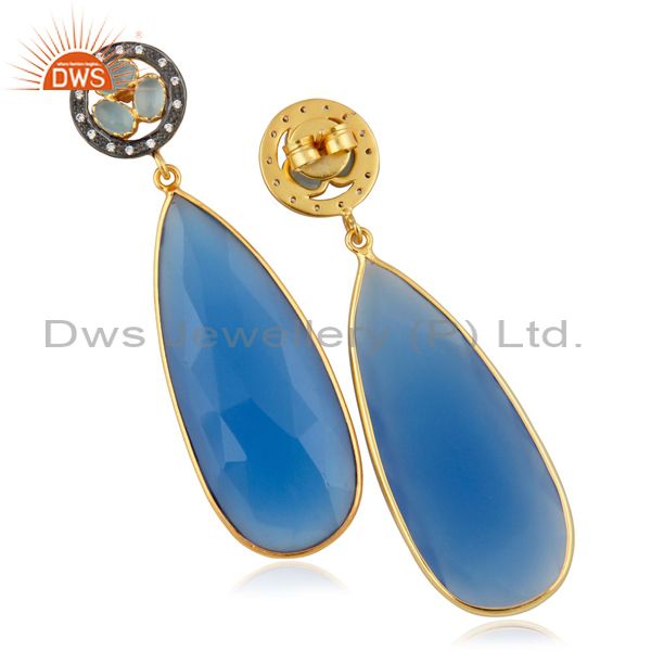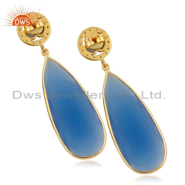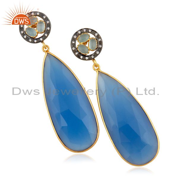14K Yellow Gold Plated Brass Blue Chalcedony Bezel Set Teardrop Earrings With Cz