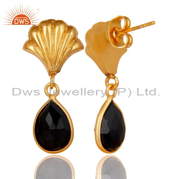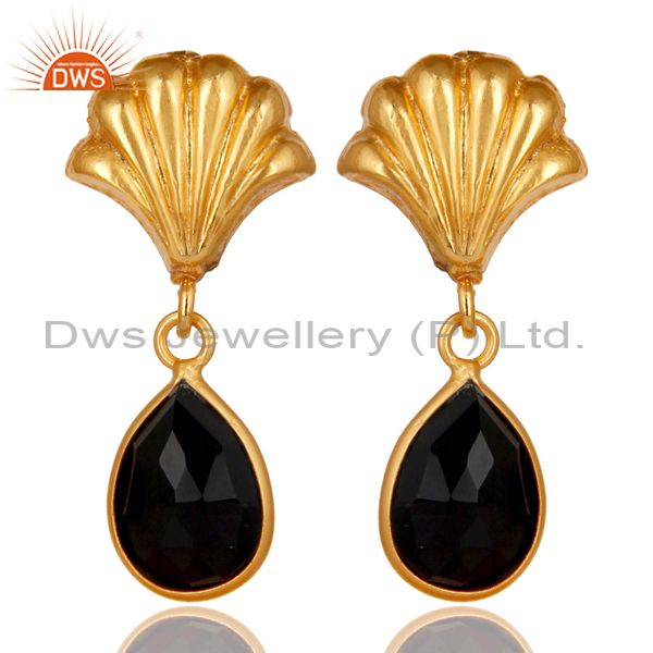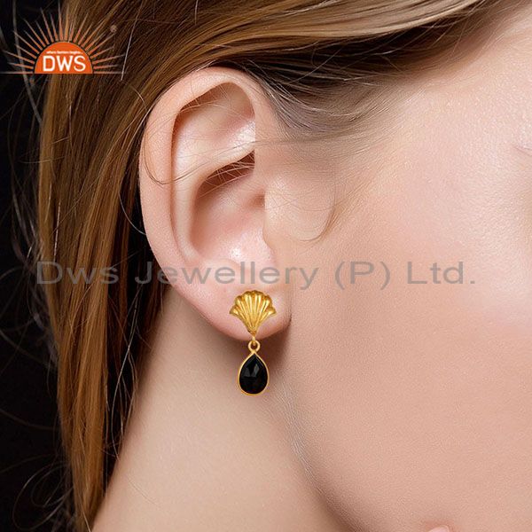 14K Yellow Gold Plated Handmade Black Onyx Bezel Set Drops Brass Earrings