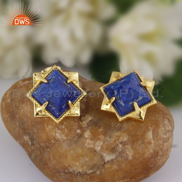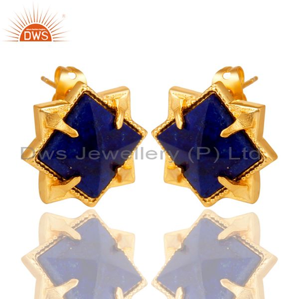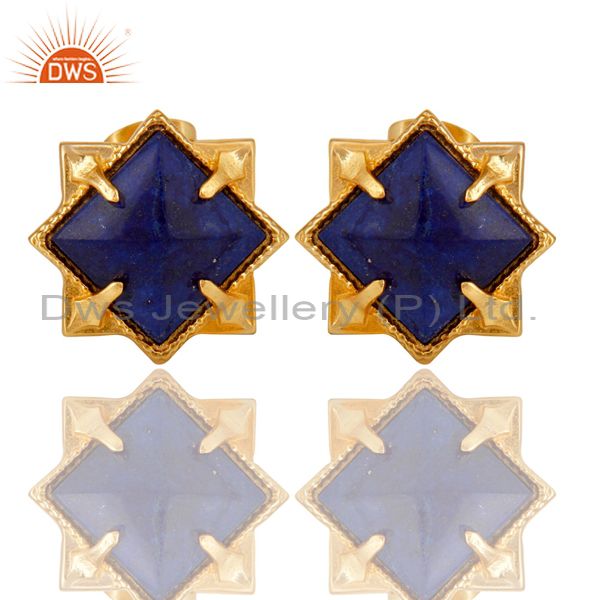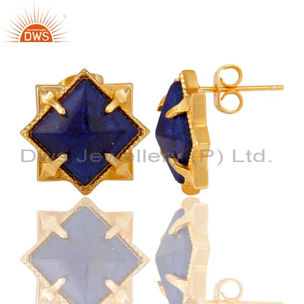 14K Yellow Gold Plated Handmade Lapis Pyramid Style Studs Brass Earrings