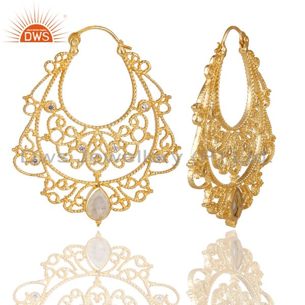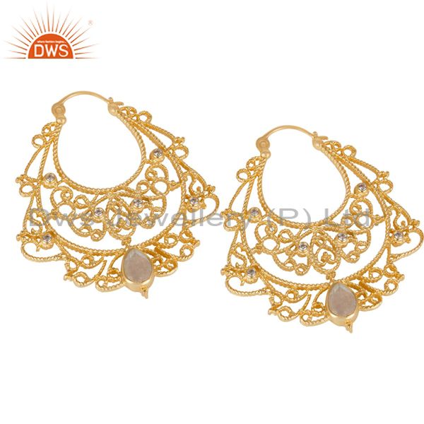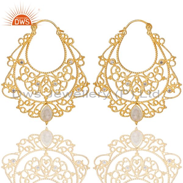 14K Yellow Gold Plated Rainbow Moonstone & White Zircon Dangle Brass Earrings