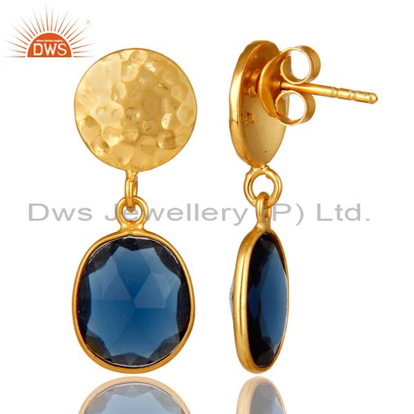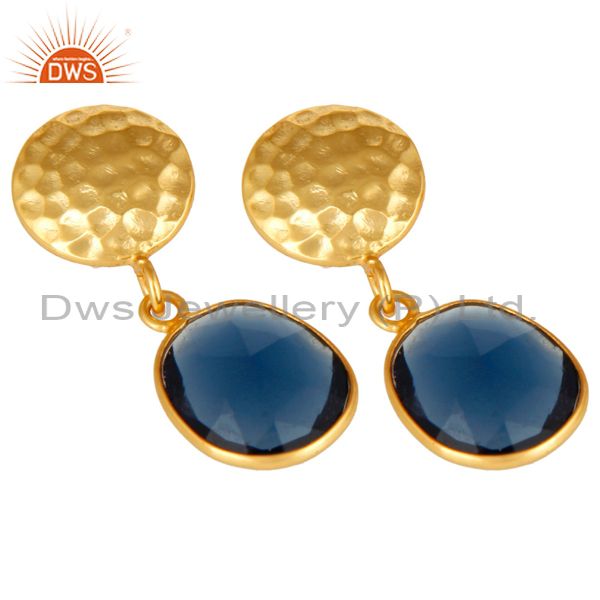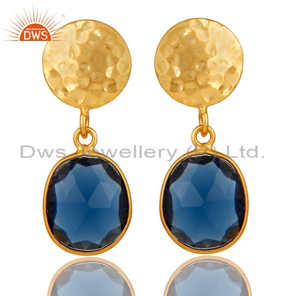 14K Yellow Gold Plated Sterling Silver Blue Corundum Bezel Set Dangle Earrings