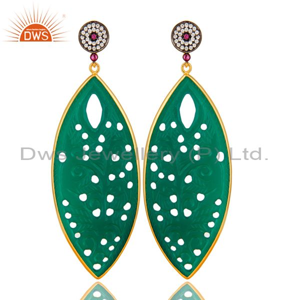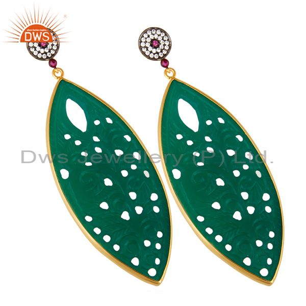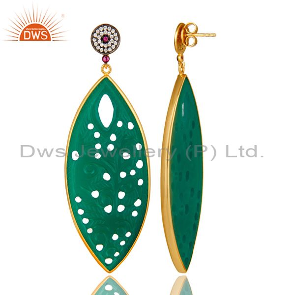 14K Yellow Gold Plated Sterling Silver Carved Green Onyx Dangle Earrings With CZ